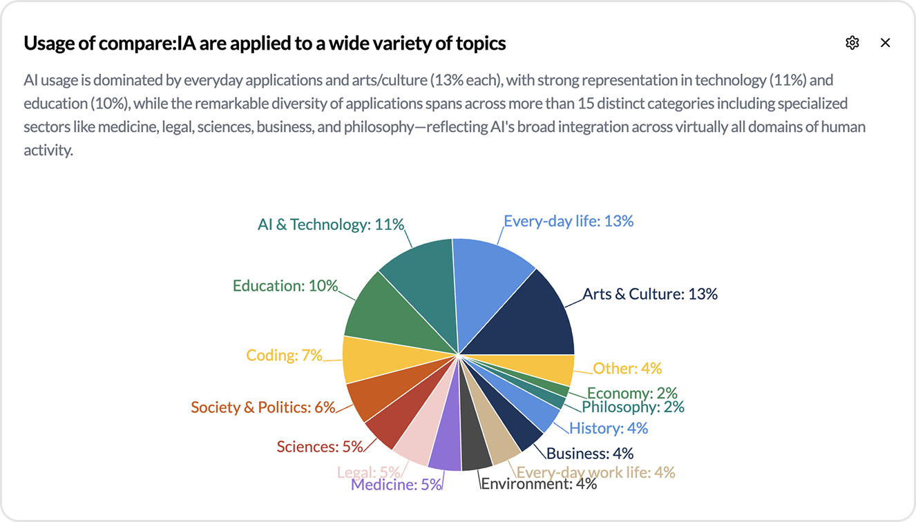 Analyse af brugeres samtaler med registrering af opgaver (oprettelse, informationssøgning osv.), emner (kunst og kultur, uddannelse osv.), komplekse følelser (nysgerrighed, entusiasme osv.), sproglig tone (formel, professionel osv.)